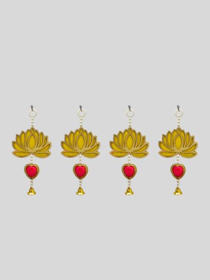 Bring positivity and elegance to your home with this handcrafted lotus wall hanging. Featuring a golden lotus motif, pearl beads, a red velvet heart centerpiece, and a golden bell at the base, this décor piece is perfect for doors, walls, balconies, pooja rooms, and festive occasions. The lotus symbolizes purity and harmony, making it an ideal choice for both spiritual and decorative use.